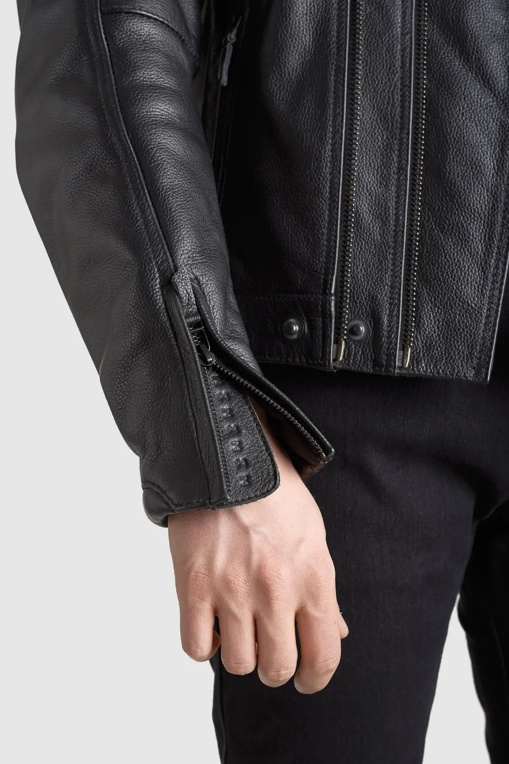 - Matt black YKK zippers with leather pullers